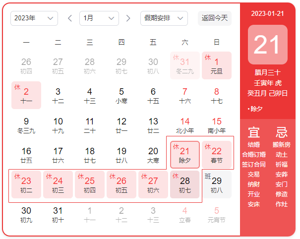 Holiday time: January 21, 2023 (New Year's Eve) to January 28 (the seventh day of the new year) for a total of 8 days