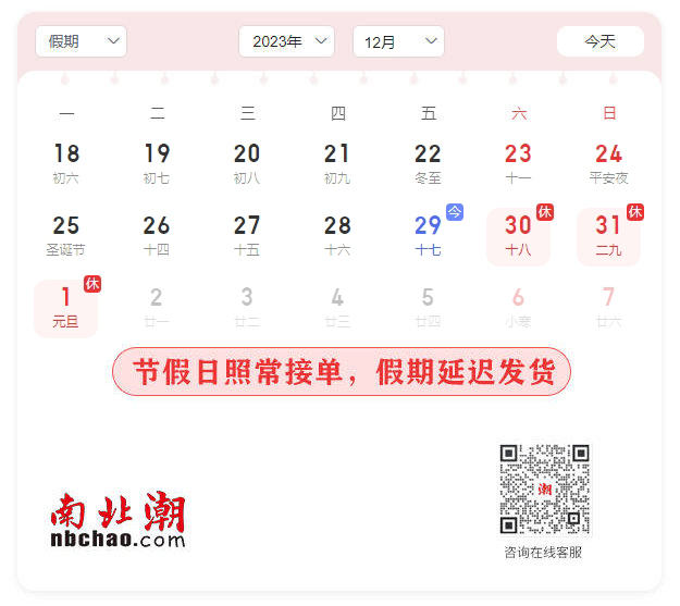 During the holiday, indent delivery arrangement: From December 30, 2023 to January 1, 2024, delivery will be suspended. All indents will be shipped uniformly on January 2, 2024 (Tuesday) after the holiday!