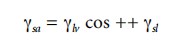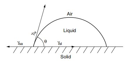 Many years ago, Young proposed that the contact angle represents the vectorial balance of three tensors, the surface tension of a solid in air (Ysa), the surface tension of a liquid in equilibrium with vapor (Yw), and the interfacial tension between a solid and a liquid (Ys), the balance of forces can be written as