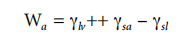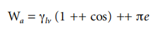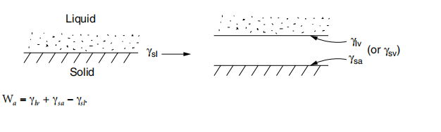 The work of adhesion (W) is the thermodynamic work necessary to separate the liquid from the solid without doing any additional work, such as viscous deformation or elastic deformation of the liquid or solid. Dupré3 is considered the definition of adhesion work. When the liquid separates from the solid, new solid-gas and liquid-gas interfaces are created, while the solid-liquid interface is destroyed.