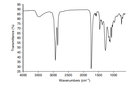 An infrared spectrum, as shown in Figure 1, is a plot of the y-axis of infrared radiation transmitted or absorbed by a sample versus the wavenumber or wavelength on the x-axis. Since no two substances that absorb infrared radiation absorb it at the same frequency, the infrared spectrum is a substance's "fingerprint" that helps distinguish one molecule from another. Also, apart from certain hydrogen bonding situations or chemical reactions taking place, the spectrum of a mixture is simply the sum of the spectra of the individual components that make up the mixture. Figure 8.1 shows the infrared spectrum of an alkyd resin and oil on an exterior primer. In addition to being a fingerprint, infrared spectroscopy can explain molecular structure. Functional groups have characteristic absorption properties. For example, carbonyl compounds, such as polyester in Fig. 8.1, have strong absorption near the 1700 wavenumber.