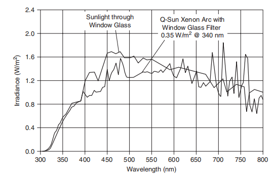 Figure 16.4 Q-Sun Xenon Arc with window glass filter and sunlight through window glass
