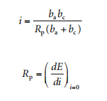 where ba and bc are the Tafel equation coefficients (b ≈ 1/αnf), α is the transfer coefficient, n is the number of electrons in a reactant molecule participating in the reaction, and f = F/RT (F = Faraday number).