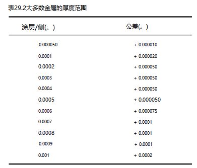 Electrolysis is performed in very thin, dense layers on the base metal. The electrolysis process doesn't build up on corners or sharp edges; it conforms perfectly to the surface. There is no change in the conductivity or magnetism of the base metal. Electrolytic deposits range from 0.000010 to 0.003 inches per side. Useful coatings range from 0.000025 to 0.01 inches. Average deposit is 0.0004 to 0.0008 inches per surface. Thickness tolerances of ±0.000010 to ±0.000050 inches can be maintained, depending on the thickness and quality level specified for that part. Coating thicknesses that may exceed 0.001 inch can be applied and electrical grinding operations can be maintained after tolerance elimination. Tables 29.2 and 29.3 list thickness ranges and tolerances for most metals.
