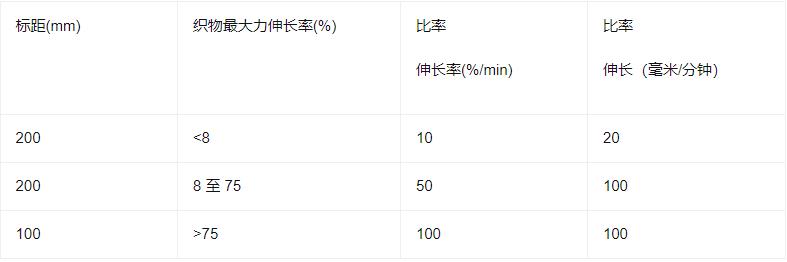 Set the elongation or elongation of the Tensile Testing Machine according to the maximum elongation of the fabric under force in the table below.