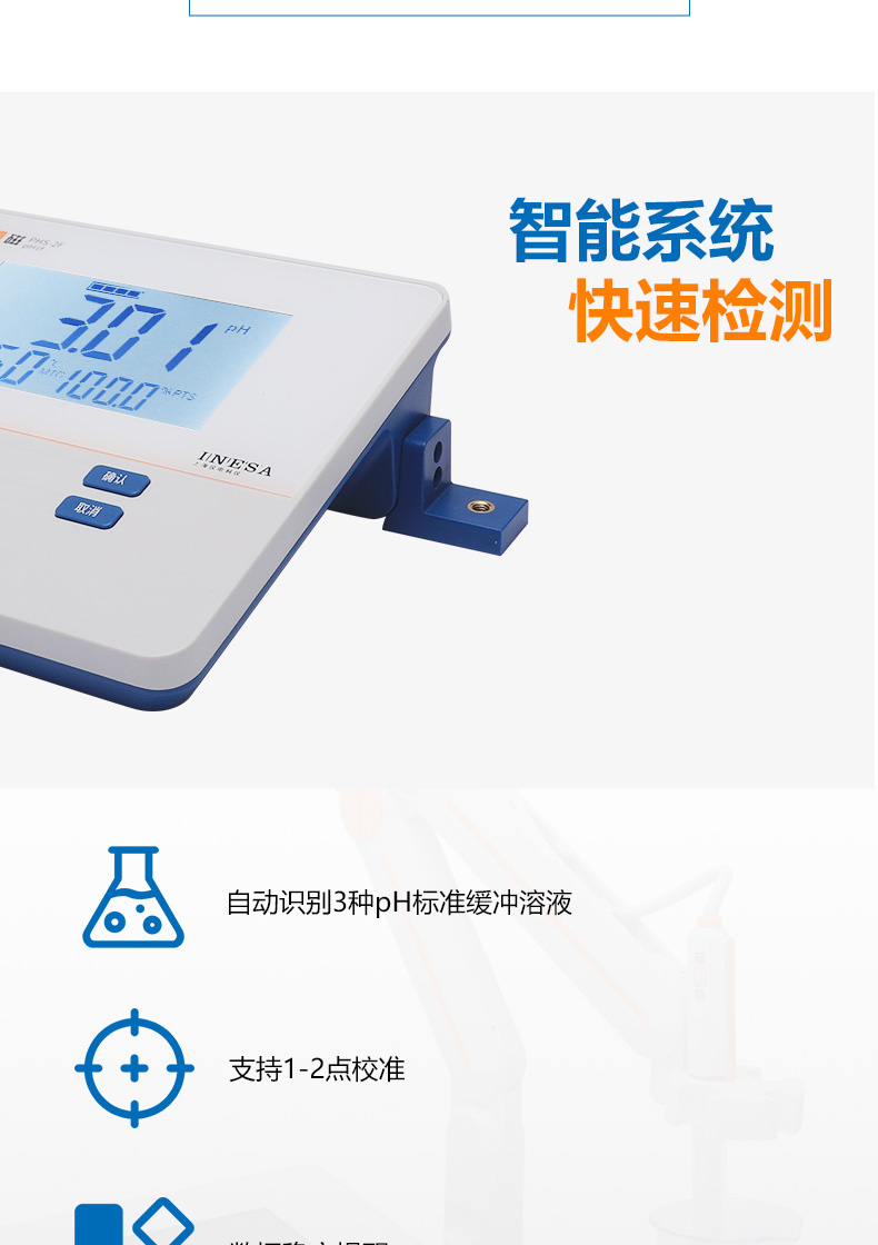 â Automatically identify three pH standard buffer solutions: GB 4.00pH, 6.86pH, and 9.18pH, and support custom pH buffer solutions