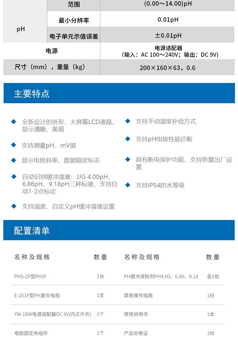 Level 0.02, 0.00~14.00PH, -1800~1800mV, high definition liquid crystal display, standard composite pH electrode, electrode bracket, dust cover and calibrated buffer powder, support IP54 protection class