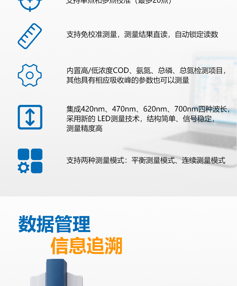 a)DGB-401 multi-parameter Water Quality AnalyzerThe LED light source used integrates four wavelengths: 420nm, 470nm, 620nm and 700nm, and the analyzer is small in size and has high measurement accuracy.