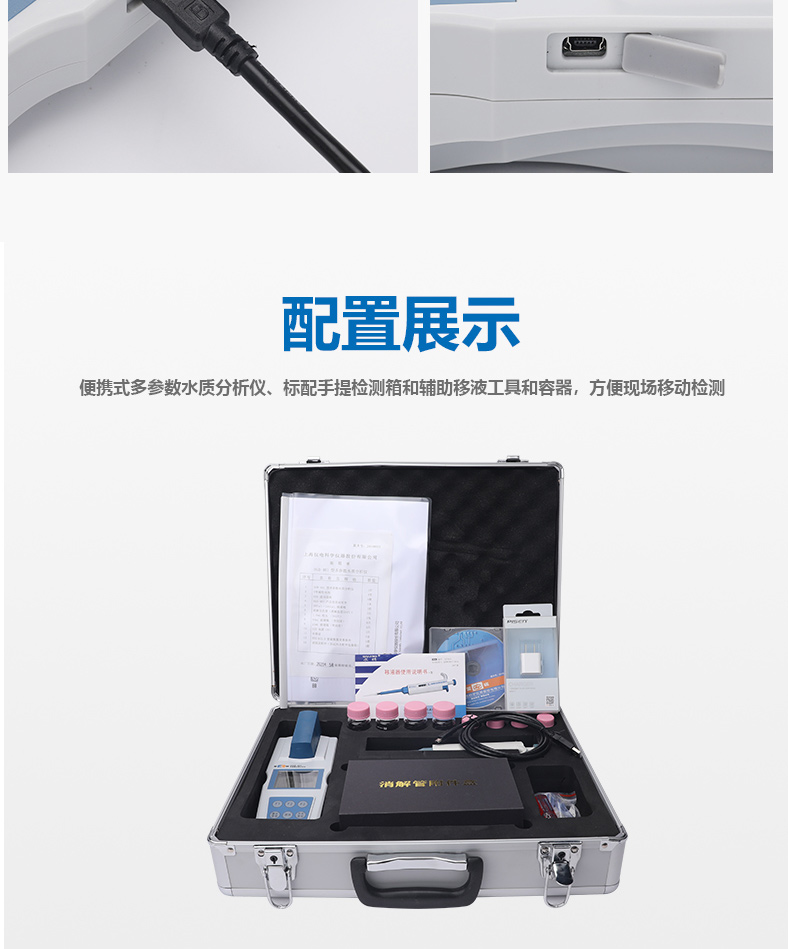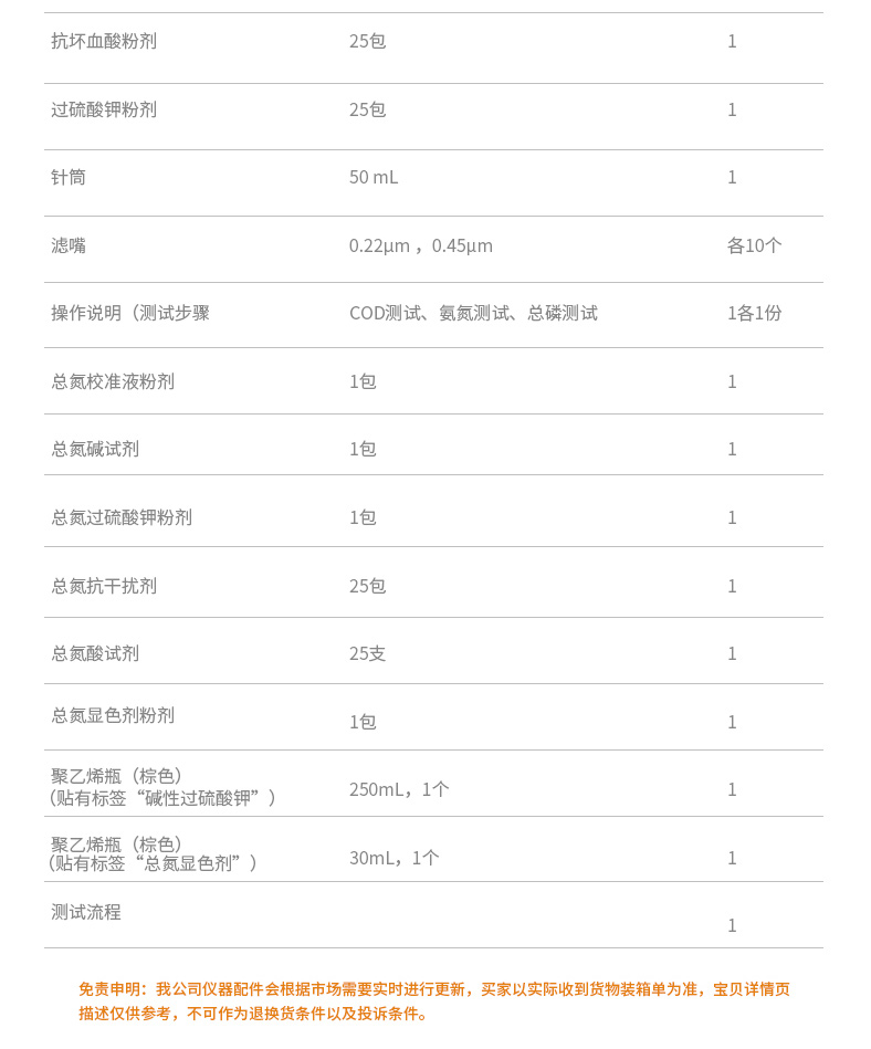 Multiparameter Water Quality Analyzer x1, Preparation: Reagent for determination of chemical oxygen demand (COD) x1, Reagent for determination of ammonia nitrogen x1, Determination of total phosphorus - Ammonium molybdate Spectrophotometric method, Spectrophotometry reagent x1, Colorimetric tube x1, digestion tube x1