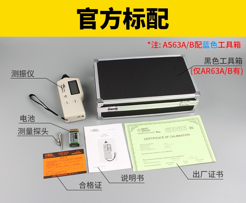Vibration meter X1, original battery X1, split probe x1, long probe x1, short probe x1, strong magnetic chuck x1, factory certificate X1, warranty card X1, manual X1, portable toolbox x1