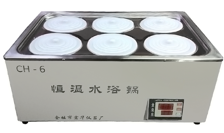 Honghua CH-6 digital display constant temperature Water Bath Temperature range RT +~ 99.9 ℃, Temperature fluctuation ± 0.5 ℃, working tank volume 20L, working tank material stainless steel, six holes, heating power 1200W.