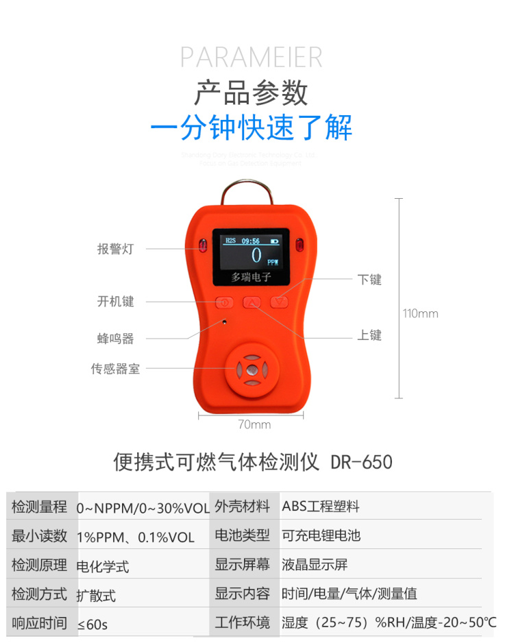DR-650 series portable single Gas Detector (hereinafter referred to as the equipment) is a portable gas detection and alarm instrument that can continuously detect the gas concentration in the workplace environment. The equipment uses natural diffusion to detect the surrounding ambient gas, which has the following characteristics: