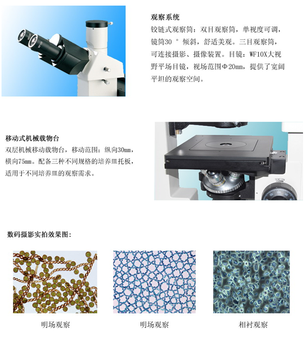 Trinocular Inverted Biological Microscope 100-400 times, with 10X phase contrast objective; with 96-well plate culture dish plate