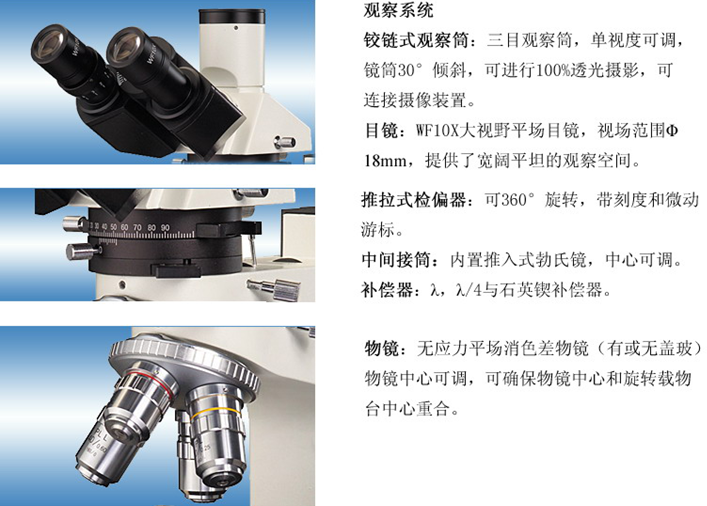 | intermediate tube | Built-in polarizer, can freely switch between normal observation and polarization observation, 90 ° swirl/spin, with scale, vernier grid value 12 '; push-in Boehr mirror, center adjustable; λ compensator; λ/4 compensator; quartz wedge compensator; |