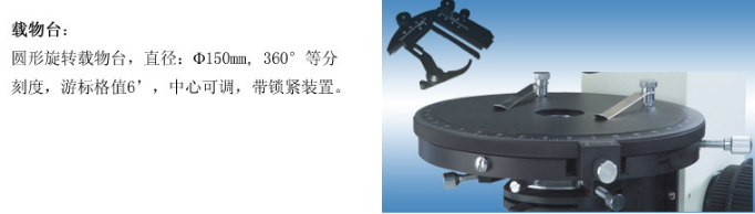 Rotary stage, 360° equal scale, vernier grid value 6', adjustable center, with locking device, the effective vertical stroke of the worktable can reach 30mm