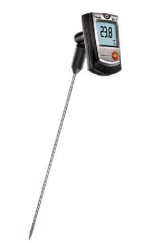 The testo 905-T1 penetration thermometer has a large measuring range of -50 ~ +350 °C and can measure temperatures of up to +500 °C in a short time (1 to 2 minutes). This is made possible by its long-integrated K-type thermocouple probe. In addition, penetration thermometers are characterized by short response times. Especially in water (or other liquids), thermocouple probes react very quickly. Penetration thermometers in laboratories, chemistry and fields are therefore ideally suited for the measurement of liquid substances.