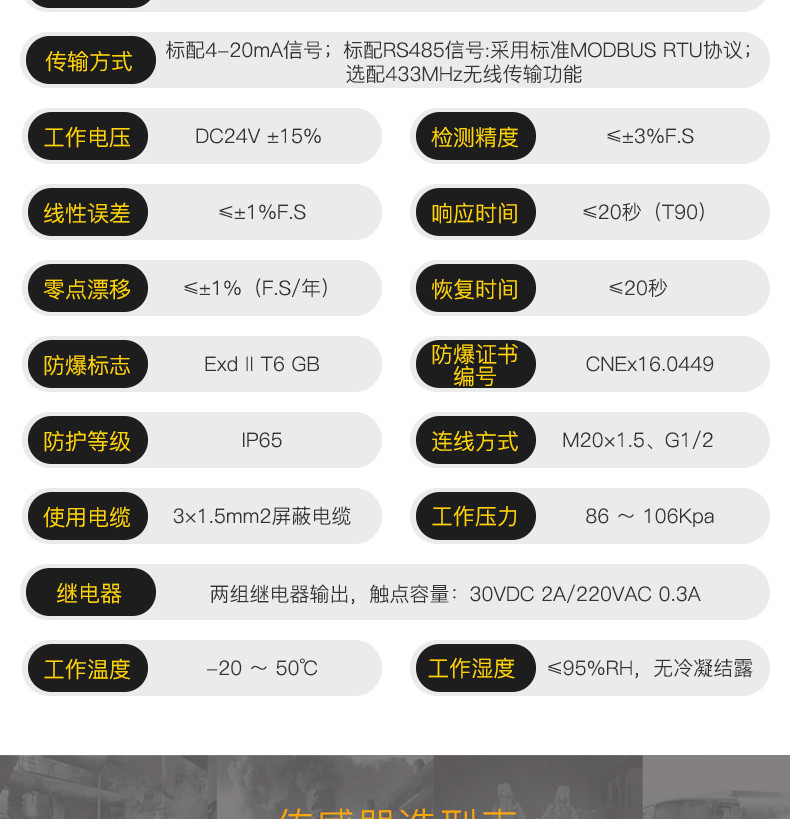 | Transmission method | Standard 4-20mA; Standard RS485 Model: Standard MODBUS RTU Protocol: Optional 433MHz Wireless Transmission Function |