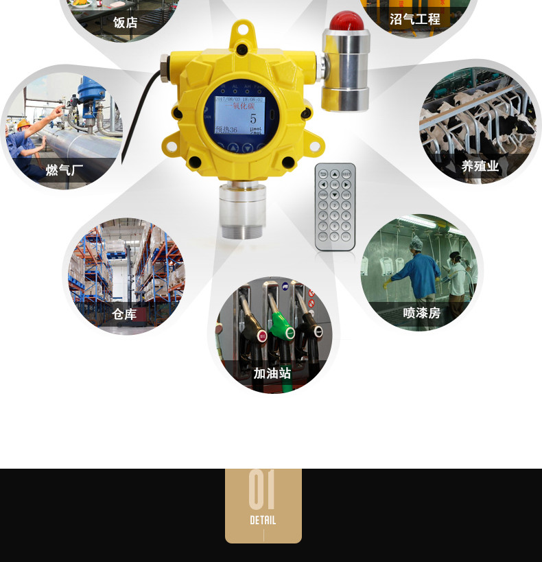 Fixed type, measuring combustible gas (PH3), range 0-20PPM, multi-parameter LCD digital display, full software calibrating, semiconductor nano-process, infrared remote control remote operation, up to 8 meters.