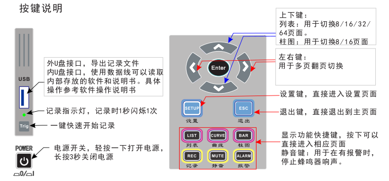 | U disk interface | Export the log file and read the software files stored in the built-in memory. |